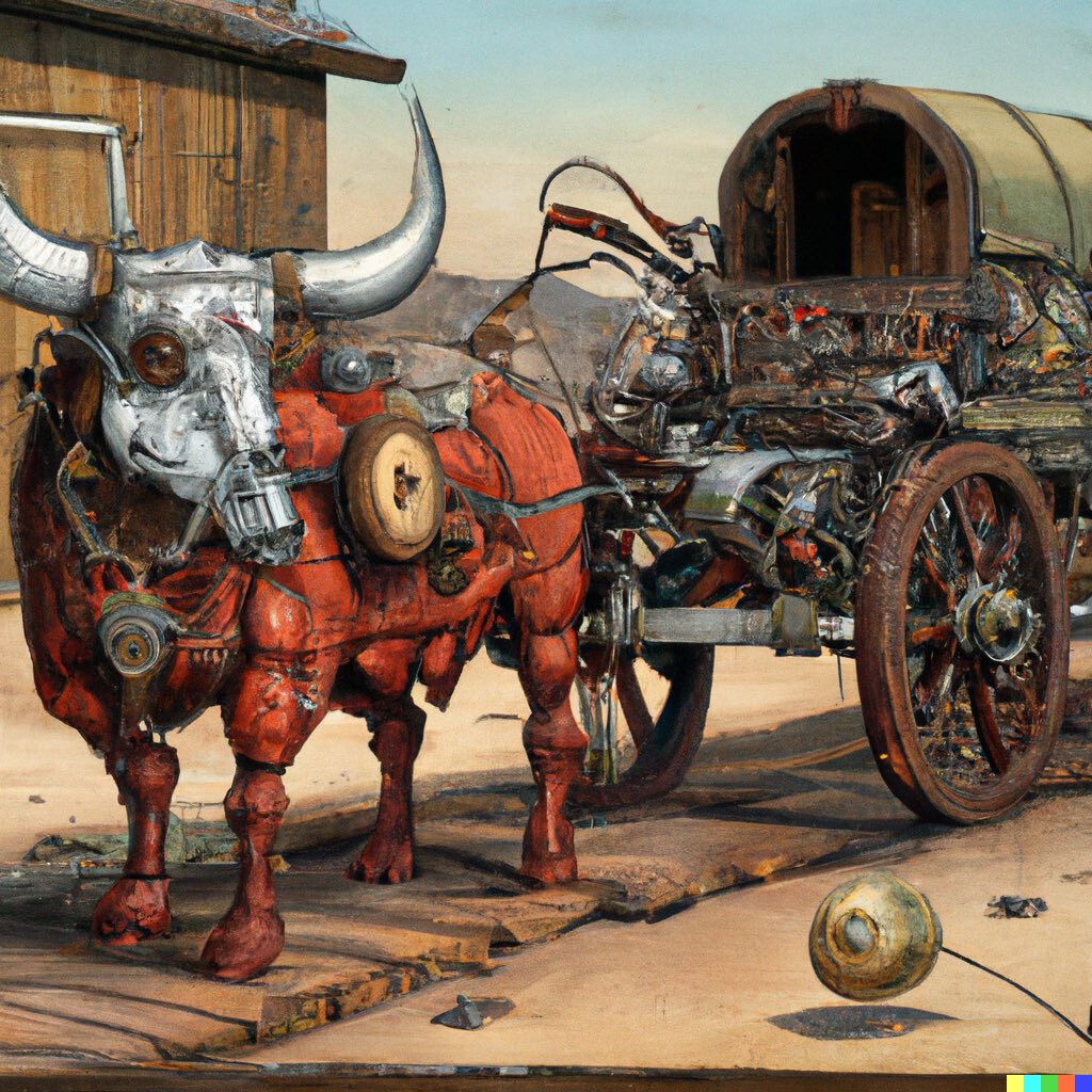 Se ha usado la frase «Cuadro steampunk del antiguo Oeste de un buey cyborg tirando de un carro modelo Conestoga» y la podéis consultar AQUÍ